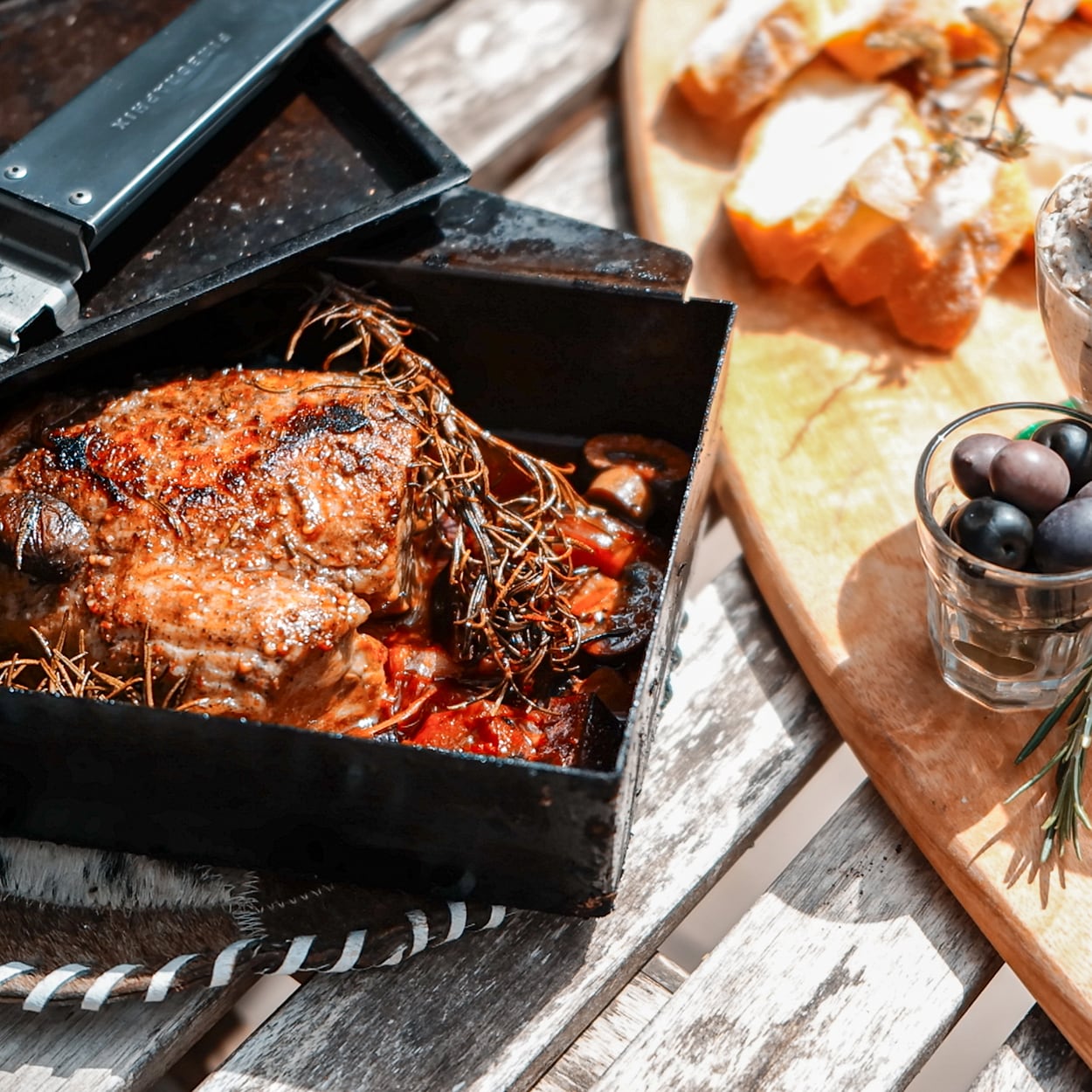 FGクッカーは、蓋がフライパンにもなるように設計されているため、鍋、フライパン、飯盒と3通りの使い方ができます。炉内の熾火にそのまま置けば、ダッジオーブンの様に熱で素材を包み込む調理も可能です。また、ご家庭のガスコンロやアウトドアでのガスバーナーの使用も可能です。